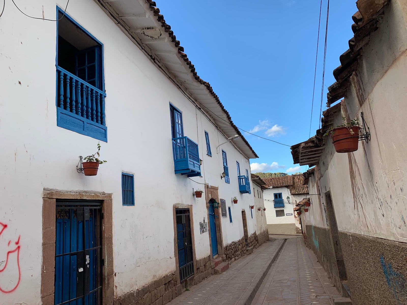 Le centre de Cusco et le quartier Barrio San Blas avec des maisons très anciennes toutes blanches aux portes, volets et balcons souvent peints en bleu.